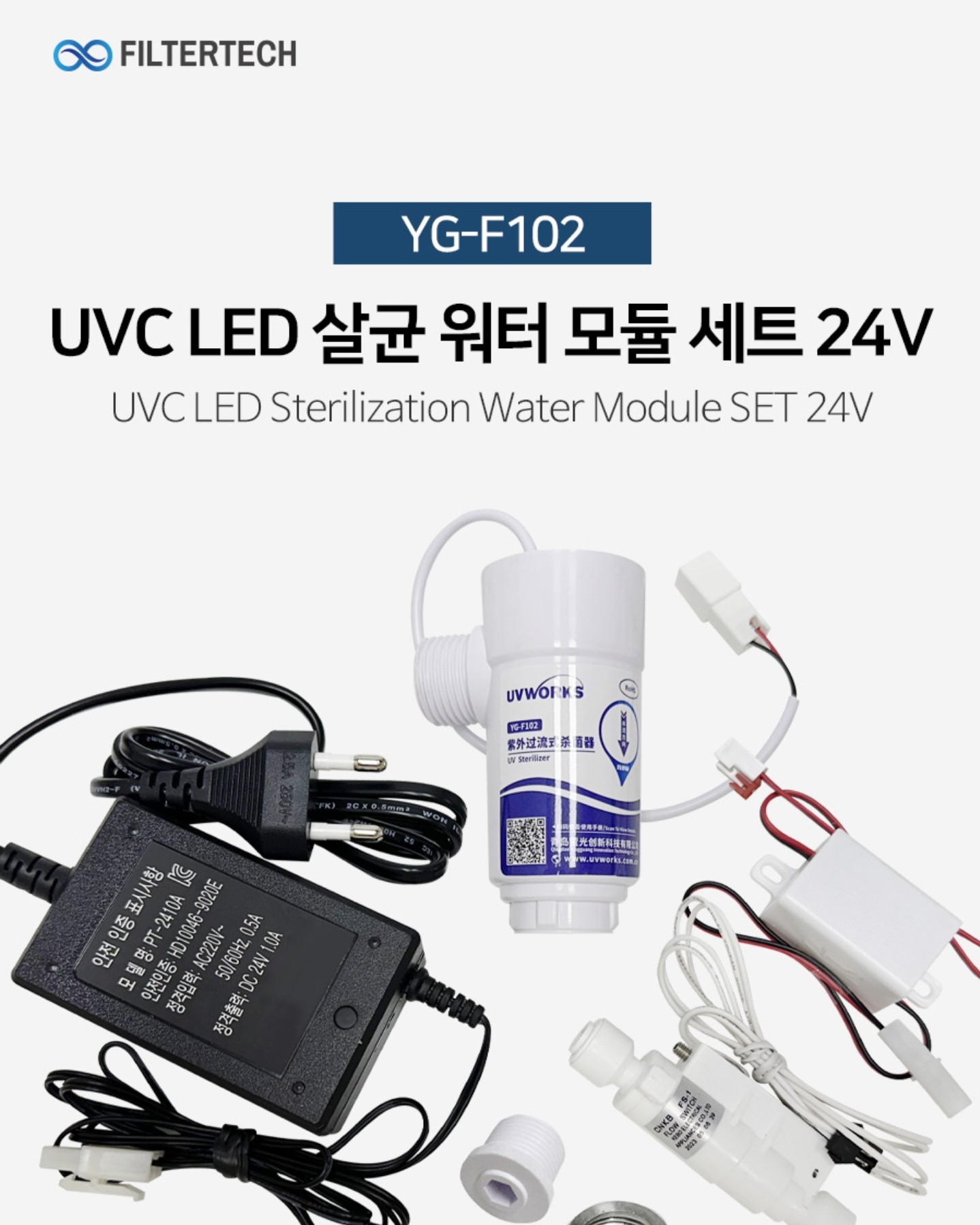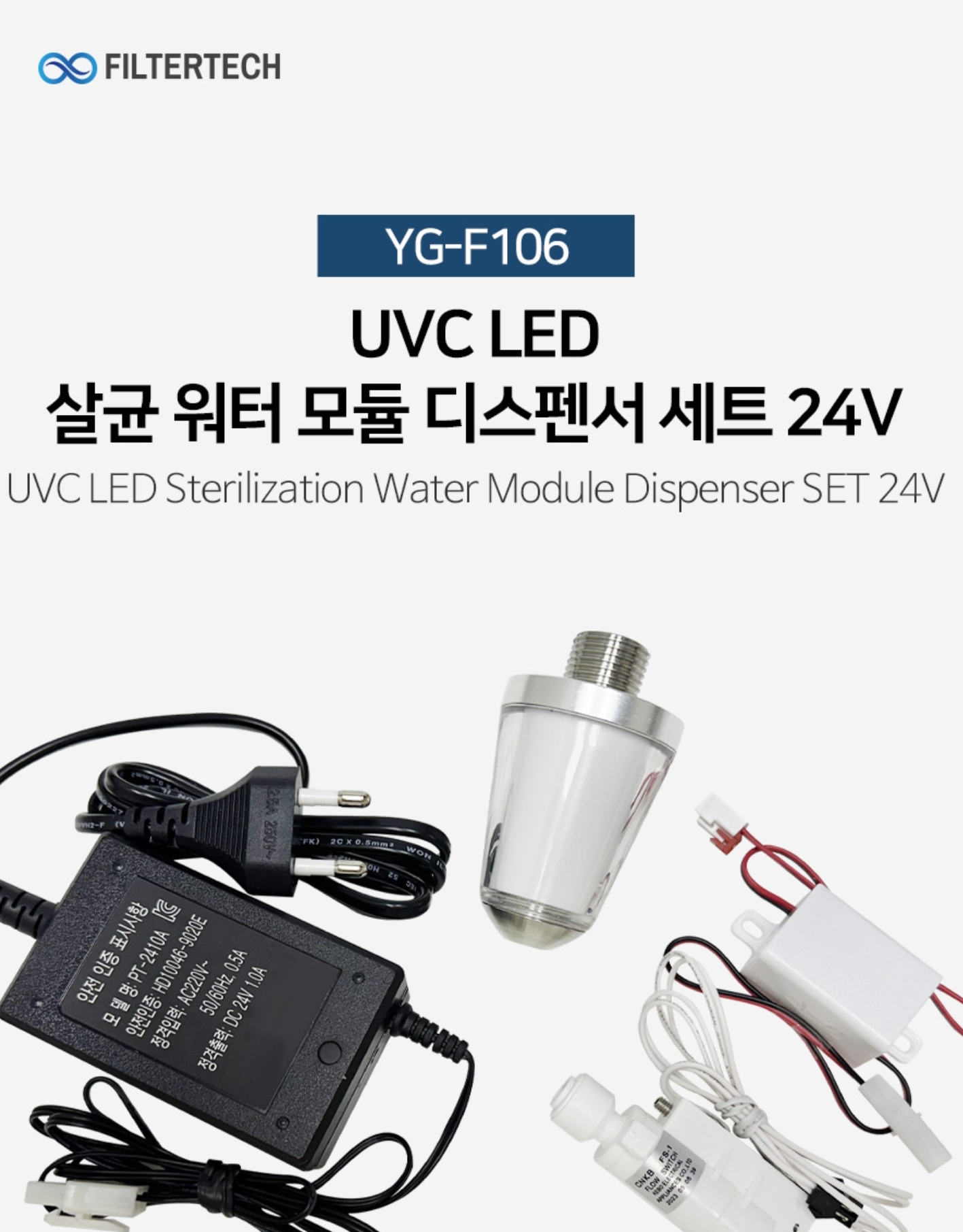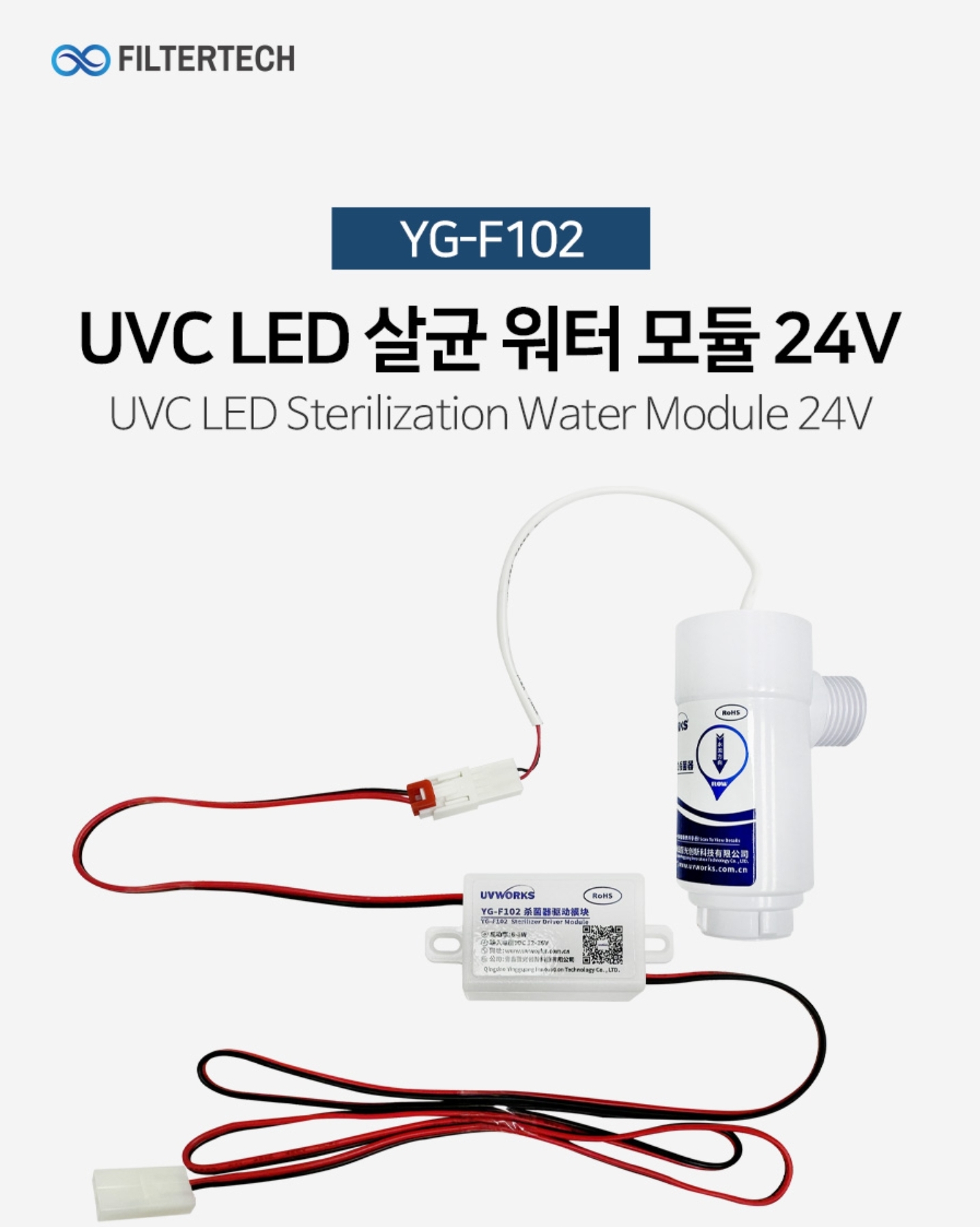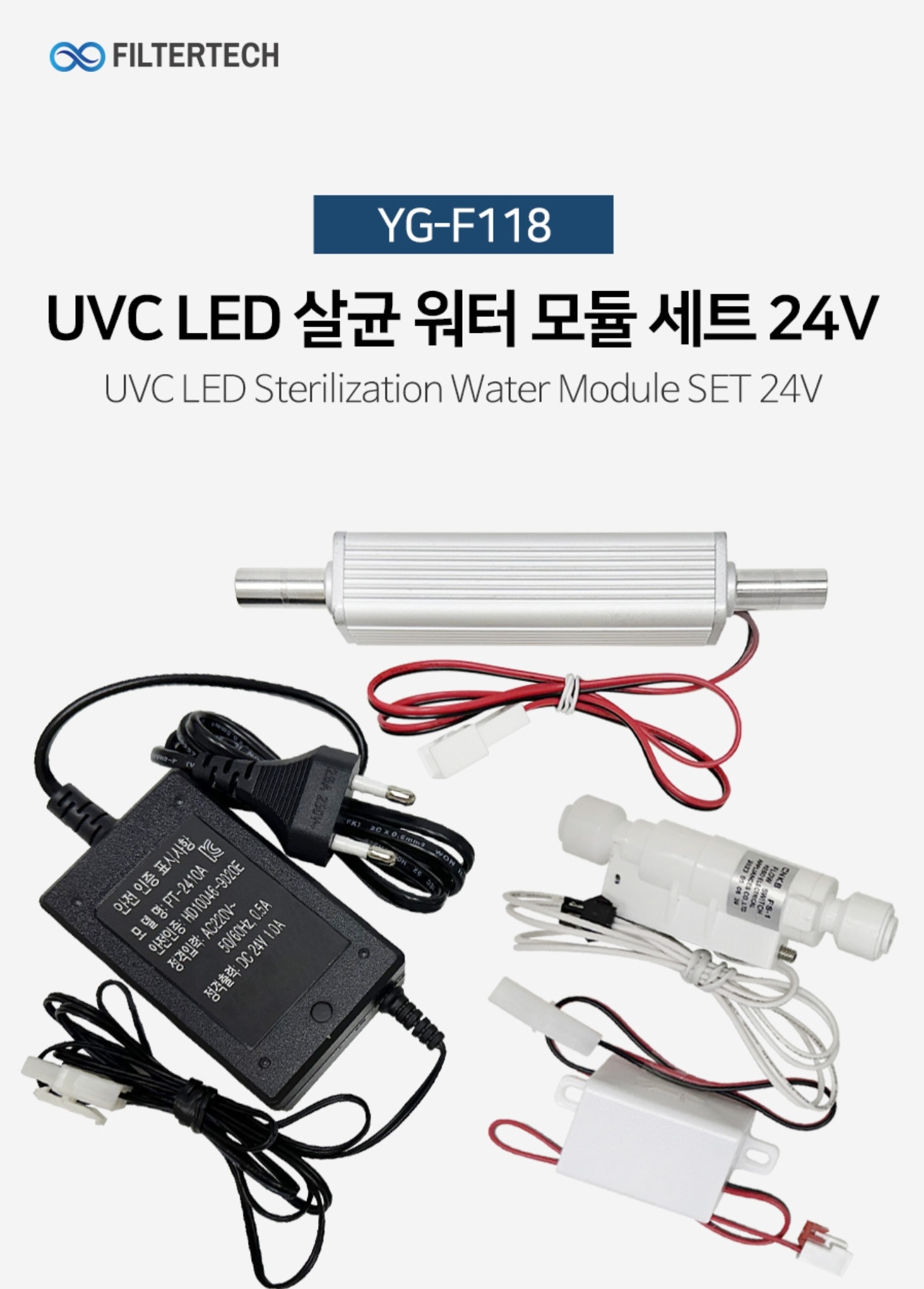 YG-F118 UVC LED 자외선살균 워터 모듈 세트(플로우스위치+아답터 DC24V 1A) 5L 24V - LED250-280nm, 파워5W-8W, 3000h, 정수기살균, 워터모듈, 살균모듈, 정수기LED모듈, UV살균, 식수소독, 워터모듈세트, LED살균세트 YG-F118 UVC LED Sterilization Water Module SET 5L 24V https://filtertechcorp.com/goods/view?no=246304YG-F118 UVC LED 자외선살균 워터 모듈 세트(플로우스위치+아답터 DC24V 1A) 5L 24V - LED250-280nm, 파워5W-8W, 3000h, 정수기살균, 워터모듈, 살균모듈, 정수기LED모듈, UV살균, 식수소독, 워터모듈세트, LED살균세트 Y..