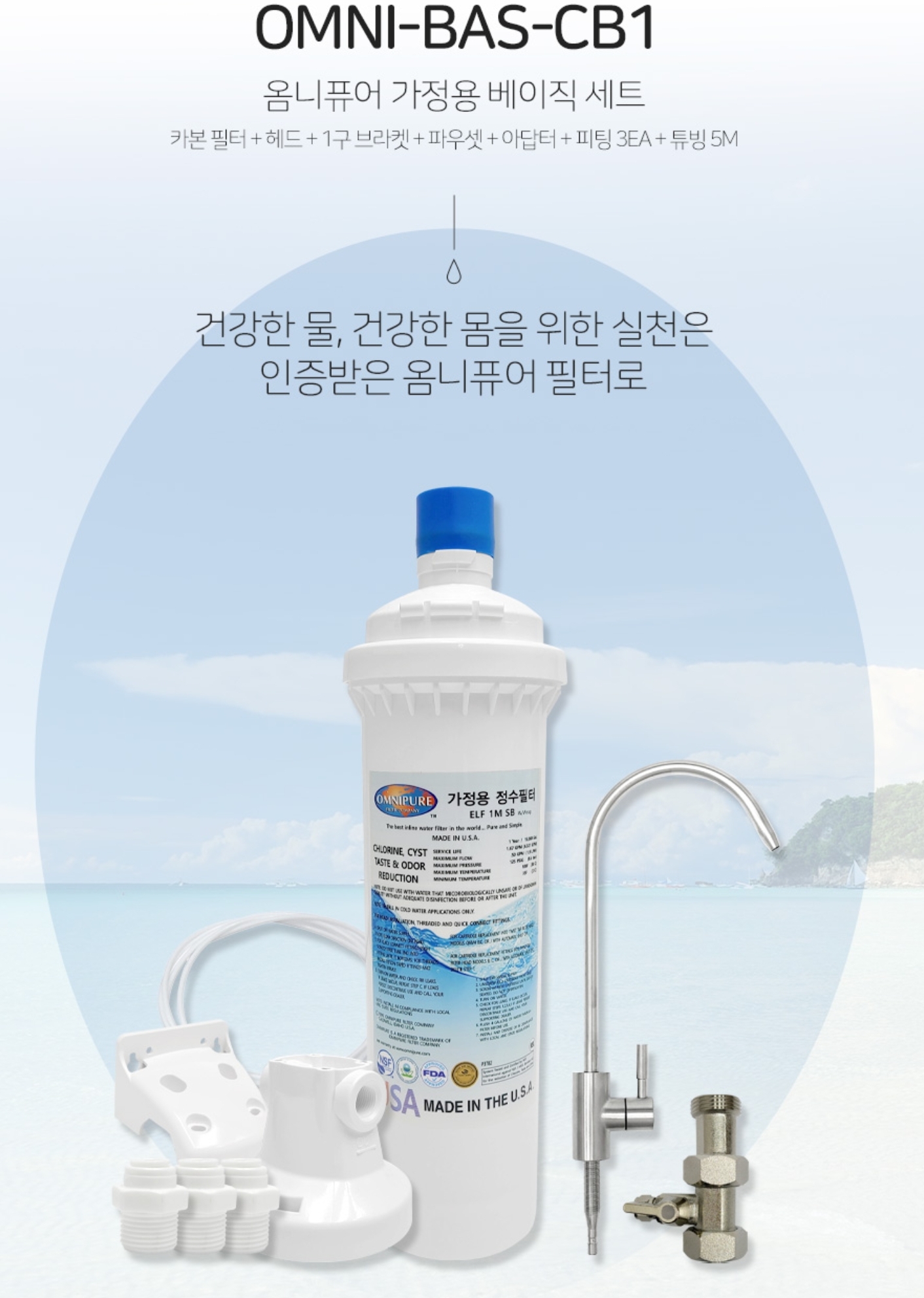 OMNI-BAS-CB1 옴니퓨어 가정용 베이직 정수 세트 - 카본필터,헤드,1구브라켓,파우셋,아답터,피팅3EA,튜빙5M,최대작동압력125psi,사용온도2도~38도,음용수용,제빙기,음식제조용 Omnipure filter basic set https://water777.co.kr/goods/view?no=234661